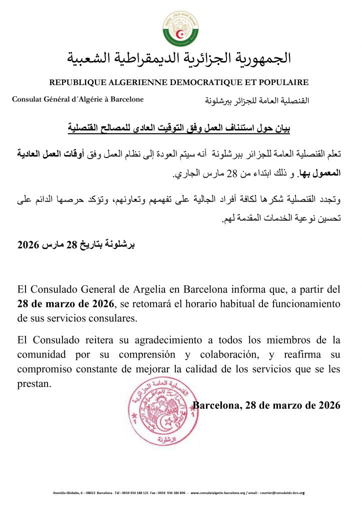 En el marco de la atención óptima a los miembros de la comunidad nacional residente en España, y con el fin de responder a la creciente demanda de servicios consulares durante este período, el Consulado General de Argelia en Barcelona anuncia que sus servicios consulares estarán abiertos todos los días de la semana a partir de mañana, domingo 8 de febrero de 2026.
